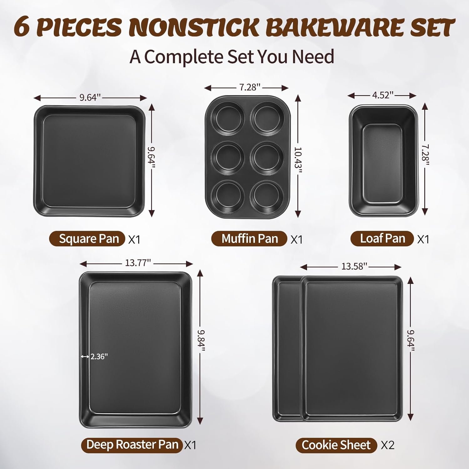 • EVERYTHING YOU NEED: Complete 6-Pieces bakeware sets non stick is designed to elevate your home cooking experience with commercial grade quality baking supplies. Includes two cookie sheets for oven, a deep roaster pan, a square cake pan, a loaf Pan and a cup muffin pan. baking sets for cooking nonstick are suitable for use in the oven, refrigerator, and freezer.